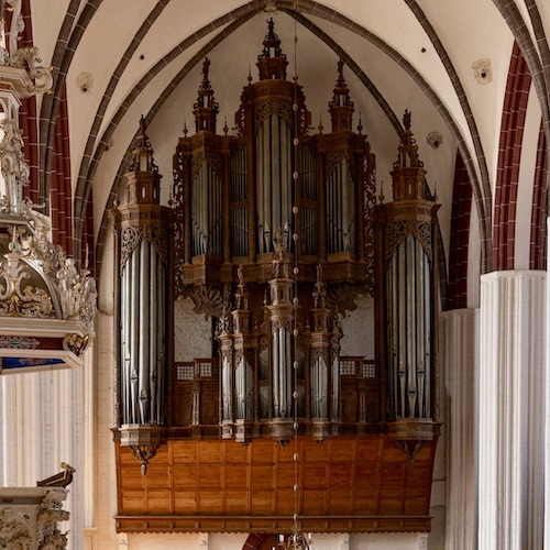 The organ in St. Stephen's Church in Tangermünde is the only work by Scherer of which both the magnificently carved case and about 50 % of the original pipes, including all the front pipes, have been preserved. This is the largest contiguous pipe inventory of an organ from this period, and therefore of inestimable value. This high amount of original pipework provided plenty of clues that allowed for the missing pipes to be reconstructed closely to the original.